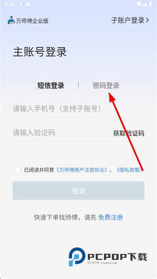 2、在主账号登录页面,点击密码登录选项,切换到密码登录界面。