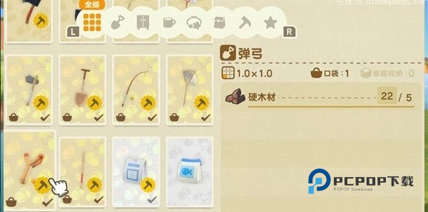 3、弹弓的制作素材需要硬木材*5,而硬木材的获取方式就只能通过斧头去砍伐树木有几率掉落。