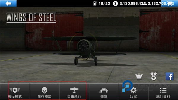 1、首先打击进入游戏可以看到三种模式:战役模式、生存和自由飞行,点击机库可以更换飞机。