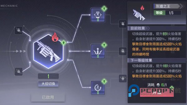 火属性。 自身攻速提升300%,击败目标会对周围造成500%火焰伤害,有一定概率提升超级武器的时间。