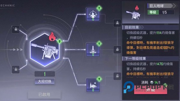 火属性。 提升灼烧伤害,命中目标时有概率会发射一枚导弹,对目标及周边造成灼烧伤害。