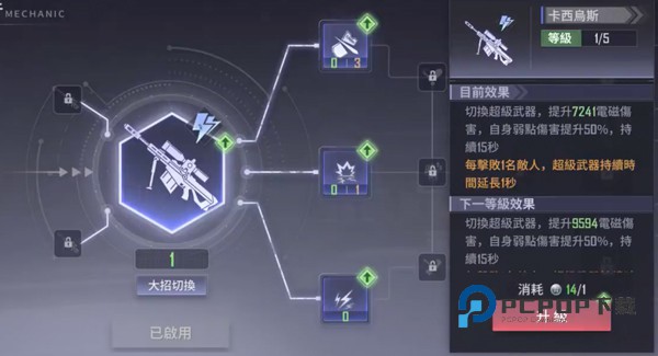 雷属性。 提升电磁伤害,弱点伤害提升50%,每击败1名敌人超级武器持续时间延长1秒。