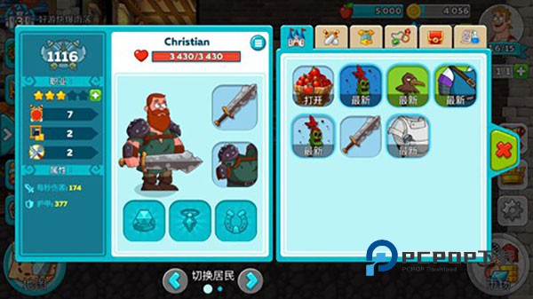 4、我们还可以点击城堡中的角色,将背包中的装备佩戴在他们身上,不过大家要注意,有一些特殊装备只能佩戴给固定角色。例如铠甲只能佩戴给坦克、法杖只能给法师等等,而且这些装备都能有效的增加该特殊角色的属性。当资金足够的时候,可以点击右下角的市场,增加新的房间。我们可以建造的房间分为生产类、训练类、支援类、宝藏类、混杂类等。