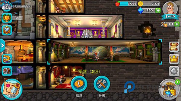 5、需要什么样的基地功能,就建造怎么用的房间即可。例如训练室可以提升自己士兵的攻击力,直接将士兵拖放到训练室即可。当军营等级提升后,我们可以招募更多士兵,这样就能在后面的战斗中拥有更多战斗力。这样基本上前期就能站住脚了,接下来就是不断的冒险挑战,获取更多资源来提升自己的城堡基地了,总有一天我们可以有实力与恶龙一较高下。