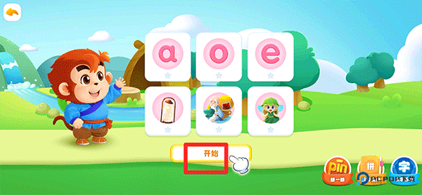 4、学习后还会有各种小试题需要孩子操作,如图孩子需要根据语音播报点击正确的拼音来帮助猴子过桥