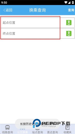 4、在换乘查询页面,依次填写起点位置和终点位置,准备进行公交换乘查询。