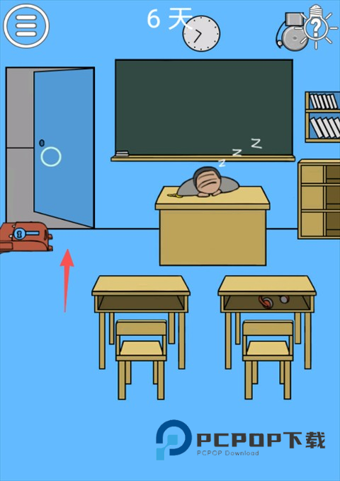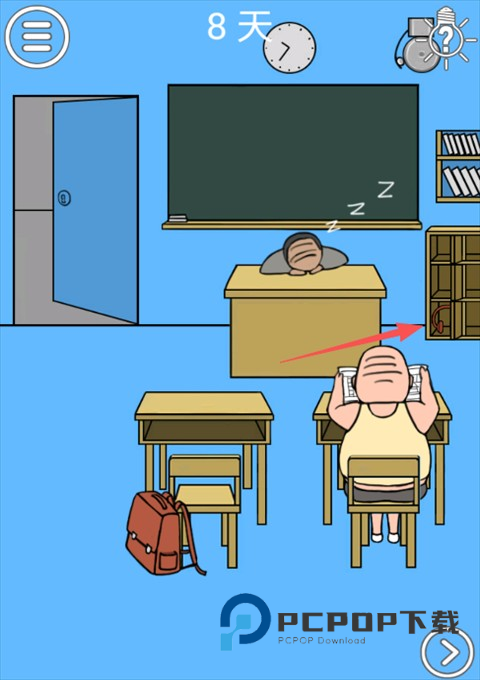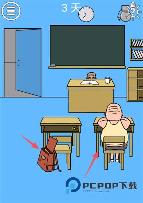 在书包里拿到一代薯条,将薯条拖动拿给旁边的死胖子。趁老师火冒三丈的教育死胖子的时候,我们就可以点击门逃离教室了。