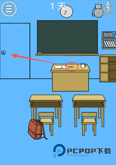 第1关很简单,点击课本获得钥匙,然后将钥匙拖到门上即可将其打开。教室门打开后,再点击一下门即可顺利逃出教室通关。