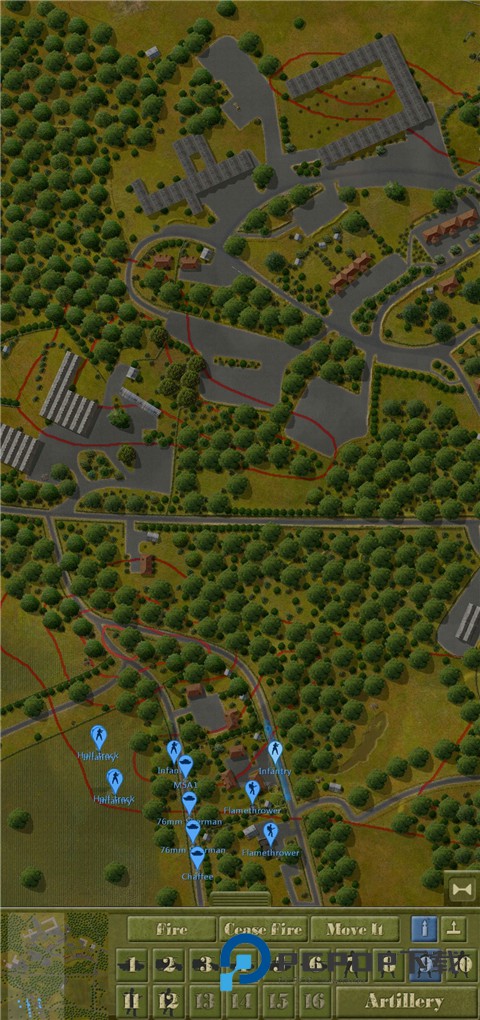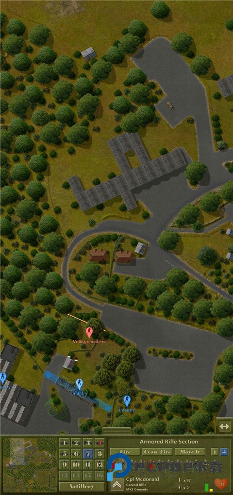 3、由图可见,这种情况非常危险。我方的余回部队被发现,但由于处于丛林复杂环境没有被交叉火力压制,我决定让他强行进攻,并派遣m5a1进行支援,地图最左端的机械步兵则进行大于回穿插,机械步兵团的位置被遮蔽物环绕,不用担心遭到火力打击。