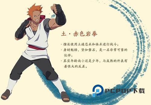 与老成稳重的外观有所不同,赤色岩拳其实是个少年——值得信赖,如同岩石一般顽强。擅长使用体术,并且利用土遁来大幅强化自身的攻击能力、保护自己的同伴,是近身肉搏战的专家。
