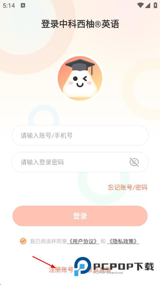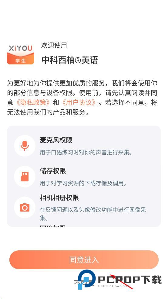 1、打开中科西柚英语APP,弹出权限及协议提示页面,仔细阅读隐私政策和用户协议后,点击“同意进入”按钮,进入登录或注册页面。