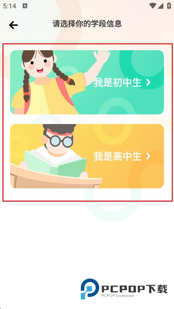 4、在学段信息选择页面,根据自身情况,选择“我是初中生”或“我是高中生”,完成学段选择后,即可进入APP主界面,开始使用相关英语学习功能。