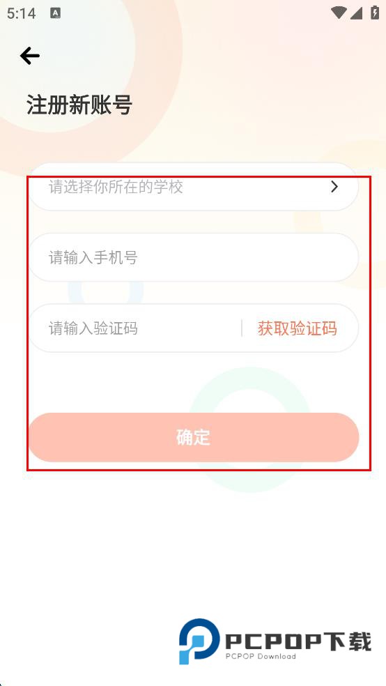 3、在注册新账号页面,选择所在学校,输入手机号码,获取并输入验证码,然后点击“确定”按钮,完成账号注册,接着进入学段信息选择页面。