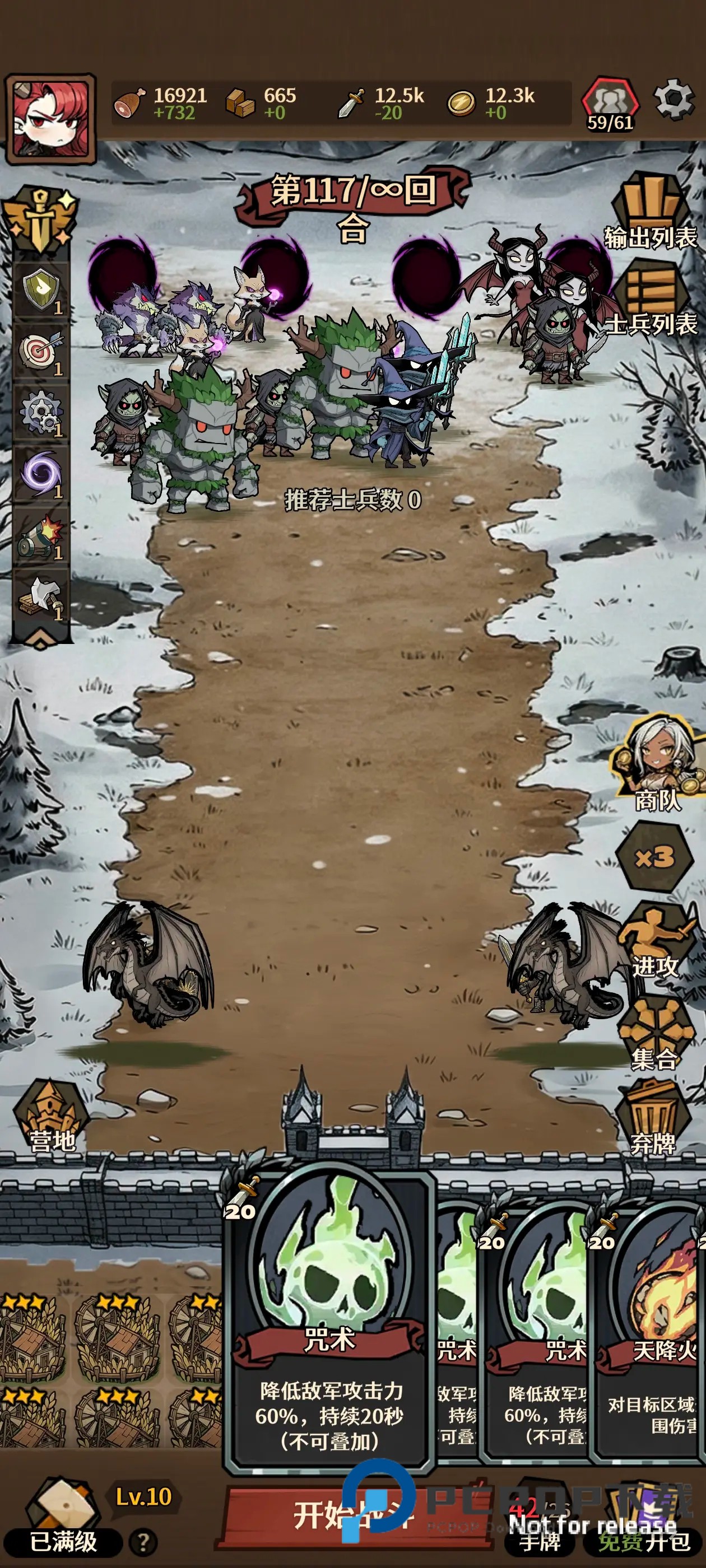 2、无尽模式我们首要的便是长期的资源收入,我们是需要龙进行主力输出,其余只需几个前排泰坦,几个辅助:火炮手对近距离敌人击退,吟游诗人给盾,祭祀加防御(有宝箱天赋的可以清楚负面效果)。