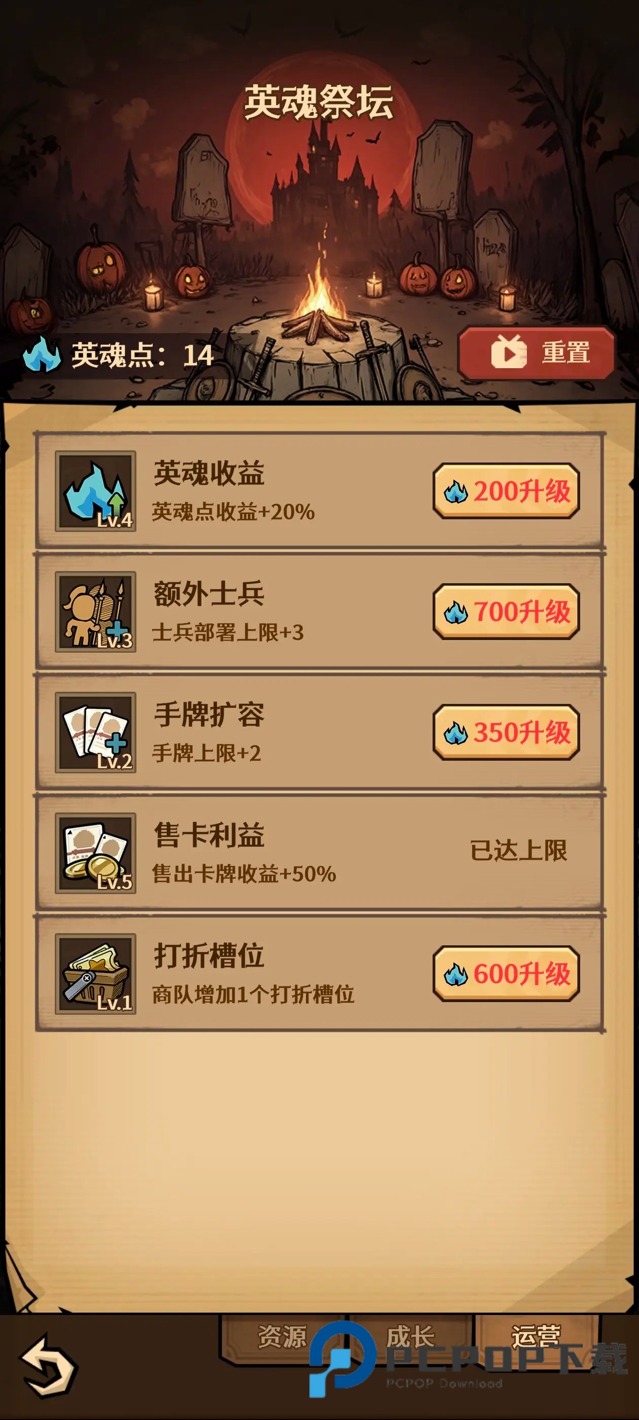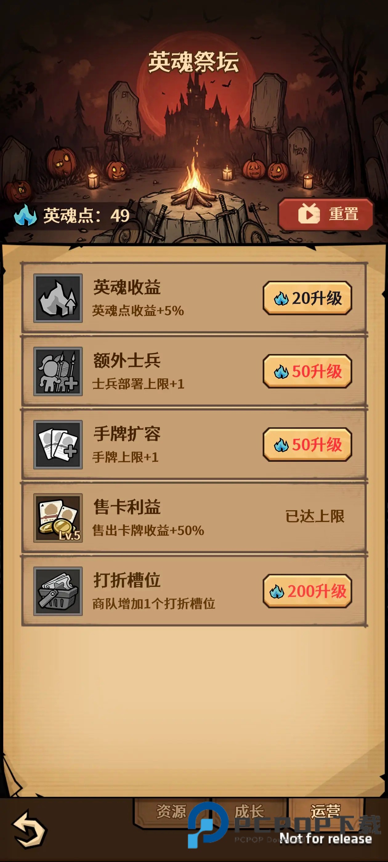 4、在你大体成型之后,只依靠火龙的百分比伤害时,再次退出,重置点数,第三页依旧点满出售卡牌收益,再点满额外士兵,手牌扩容,