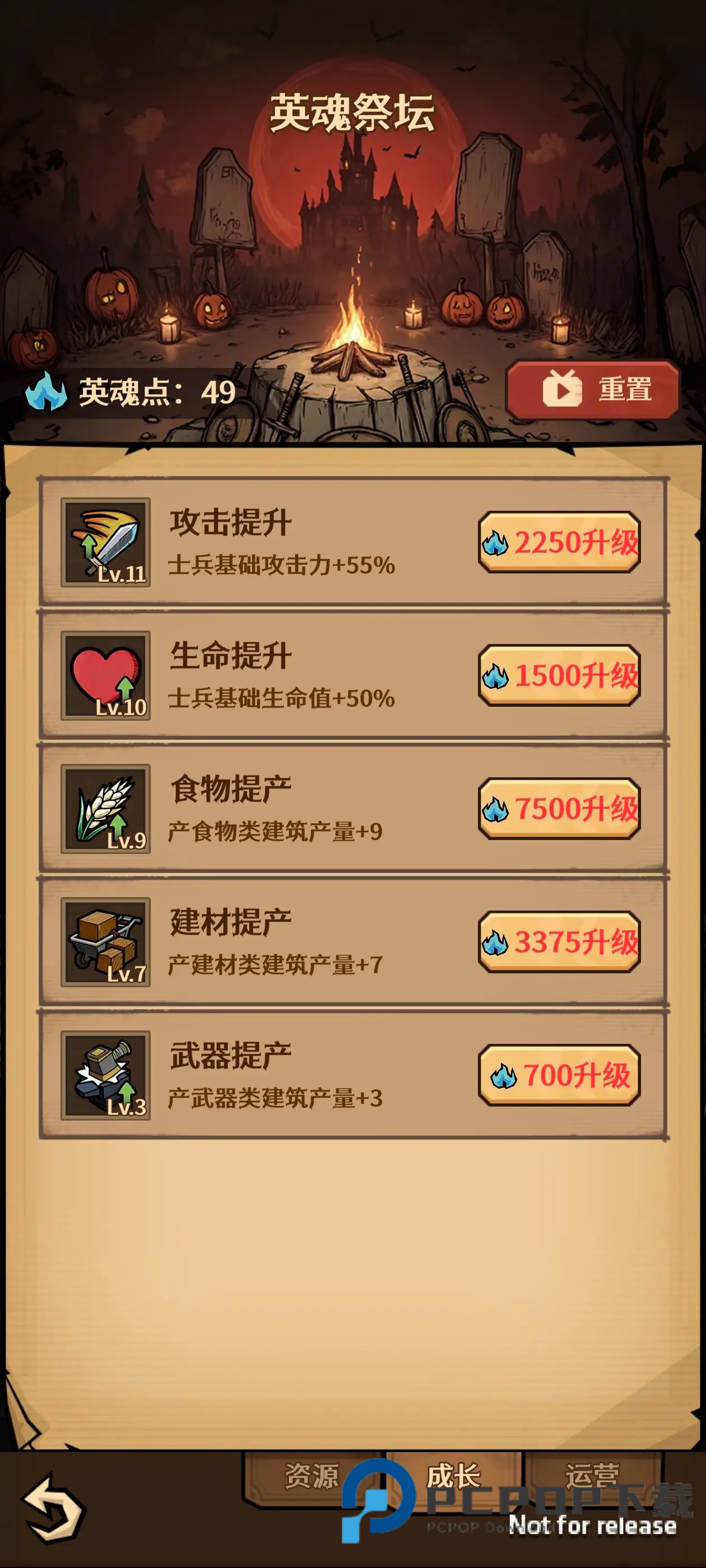 3、在进行完第一回合之后保存退出然后重置英魂点数,再将必须品出手卡牌额外收益点满,点第二页的食物提产和建筑提产,剩下都点攻击提升,生命提升。