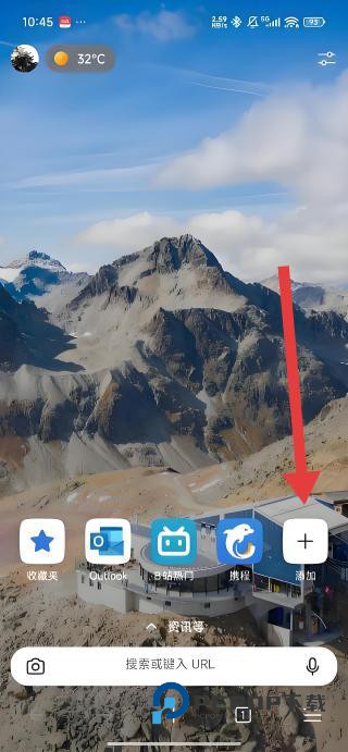 1、在浏览器主界面点击右侧添加按钮,进入包含站点、功能快捷方式的添加选择界面,开启主页定制流程。