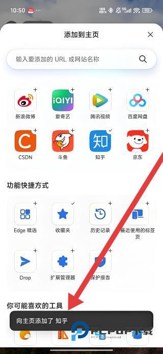 3、在添加界面选择知乎图标,完成添加操作,界面随即弹出向主页添加了知乎的提示,确认添加流程成功。