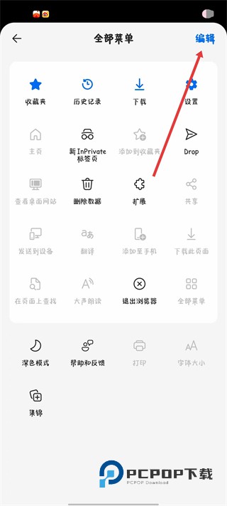 3、在全部菜单页面的右上角,找到编辑按钮,点击进入自定义菜单的编辑界面。
