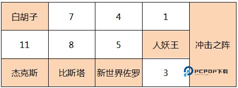输出位新世界佐罗上阵时也尽量靠前,将风墙的免伤效果最大化,前排可保持现有的人妖王或者乔兹。其他伙伴挑选输出能力强的优先,例如比斯塔、马尔高、雷利等。以下为常用阵容的推荐站位: