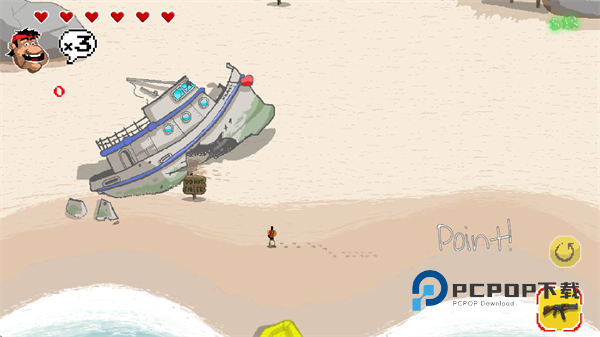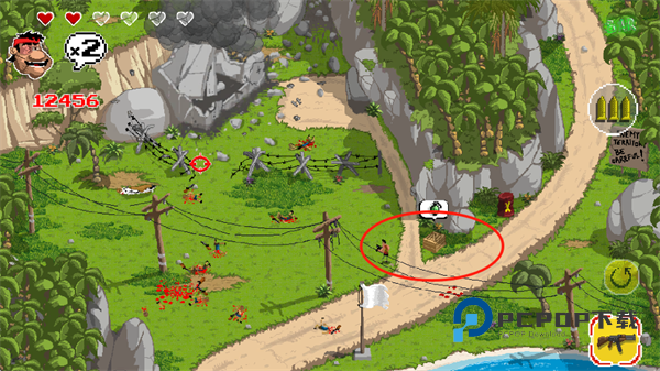 2、玩家被大海冲上沙滩,通过点击屏幕右侧的“械”开火和“圆形按钮”翻滚,通过长按屏幕也可以做到“按住哪里打哪里”的效果,角色血条和命数都在屏幕左上角可见。