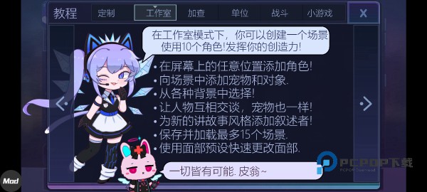 游戏中玩家可以创建自己的动漫风格角色,用自己独立的时尚风格去打扮他们,从成千上万的礼服、衬衫、发型、武器等等中进行选择,拖动衣服就能试穿,你可以为你的各个角色搭配出数千种不同风格的装扮,让他们成为游戏内最靓的仔,当你设计完自己的角色之后还可以前往工作室创建自己想象的任何场景,添加你喜好的背景,添加宠物和物品,全部为免费,而且最多可支持将10个自定义角色加入场景进行活动。
