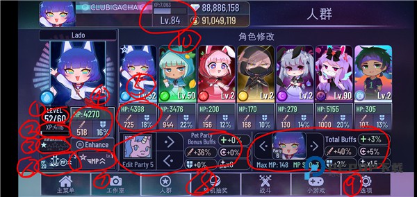 ①:点击的角色的等级(斜杠左边)和目前能升到的最高等级(斜杠右边),可以点击不同的人物来查看。