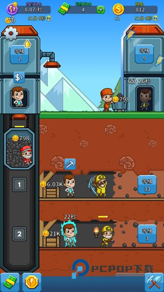 5、当经理头上出现小锤子的图案时,点击小锤子可以对开采的矿工进行加速,不过只有60秒的加速时间。黄色的矿工的箱子里最多可以装1k的金币,电梯的也是,地上推小车的矿工也同样。
