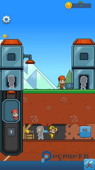 1、首先根据新手指引点击地下矿中的穿黄色衣服的矿工,然后他会进行挖矿,挖好矿后会背到左边靠近电梯的小箱子里面,这时点击在电梯中的红色衣服矿工,他会把箱子里面的东西传送到上方机器里面,然后点击在地面推小车的红衣服矿工,他会推着小车到机器下面接金币,送到原地。这三个矿工的规律性比较强,下面黄色的矿工可以一直进行挖矿,然后电梯里的矿工只需要吧挖好的矿石进行往上运送即可,地面上的工人,在机器下接住矿石推回原地就可以获取金币。