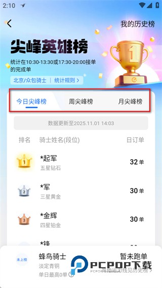 3、在我的历史榜页面,可查看今日尖峰榜等排名榜单,了解排名情况。