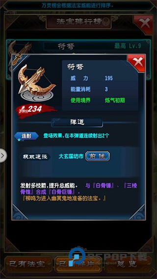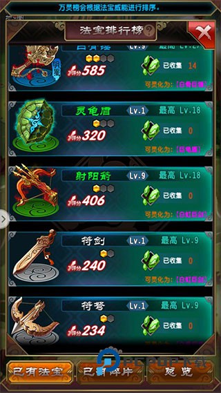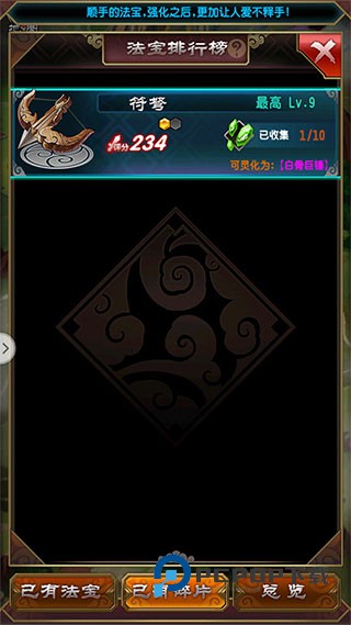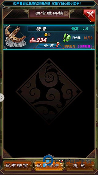 3、当法宝碎片达到合成数量要求时,会有相应的提示,根据提示合成完后收取,可以在已有法宝界面找到之前合成的法宝。