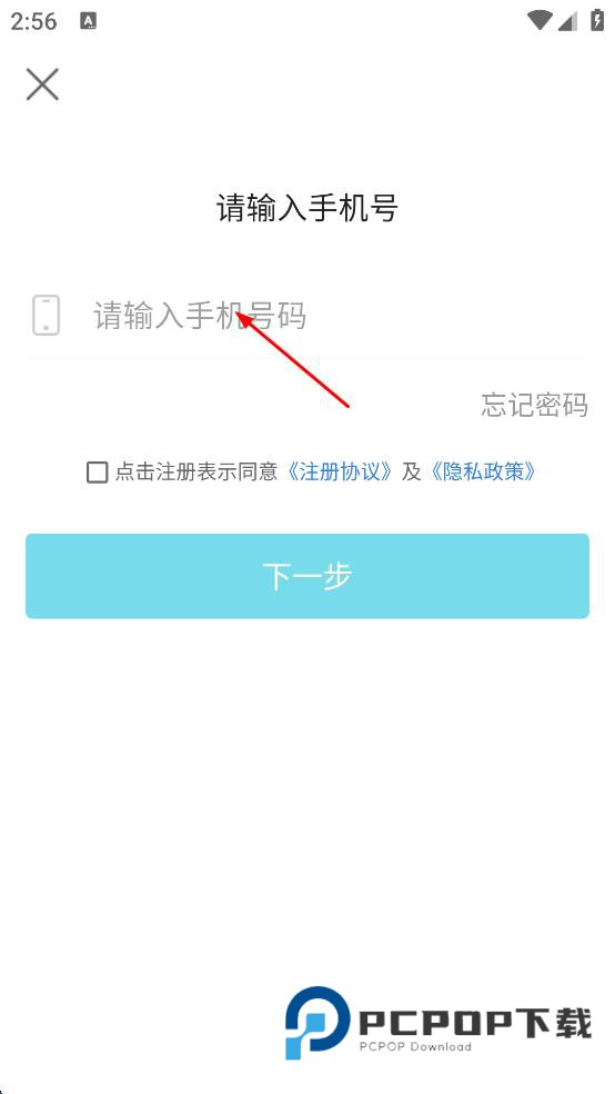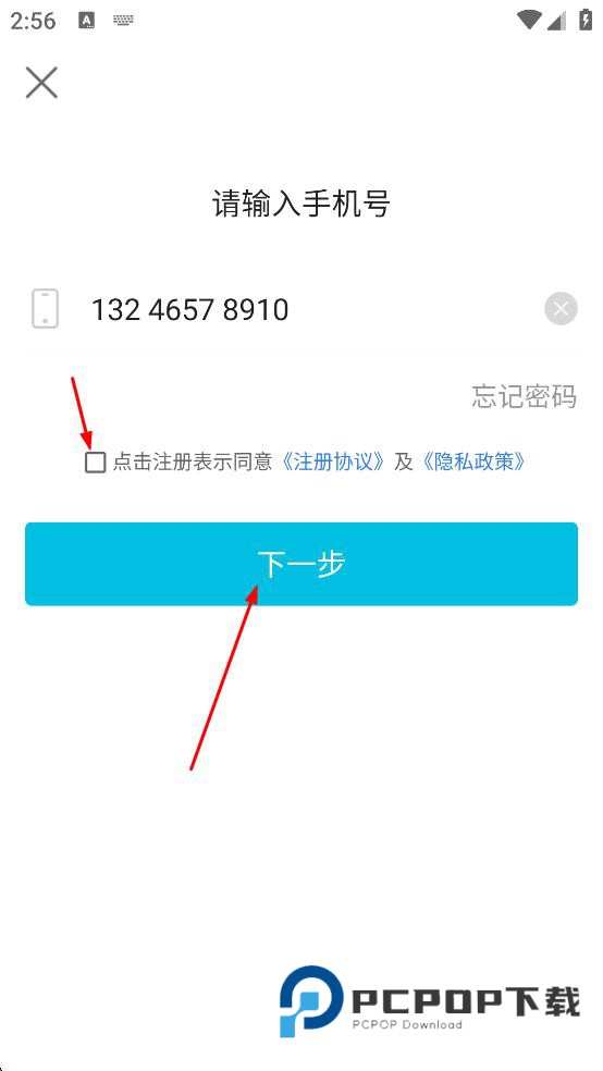 4、输入完手机号码后,勾选点击注册表示同意注册协议及隐私政策,然后点击下一步按钮,继续后续登录流程。