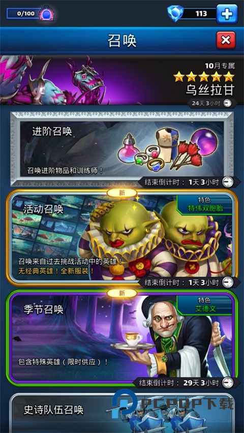 这里可以看到有几个不同的抽取方式,有最直接的epic hero summon,我们会在这里随机抽取大众英雄(因为部分特殊英雄不在这个英雄池中),所抽取的英雄为3-5星。