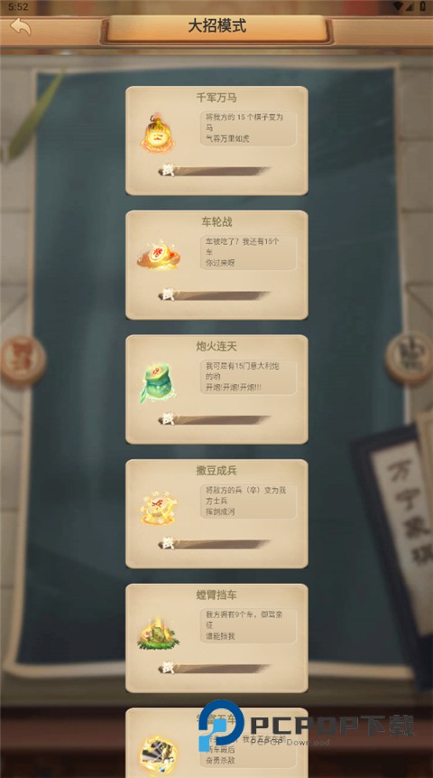 象棋大招版是一款集棋谱与实战于一体的经典象棋游戏。在这里玩家不仅可以体验到普通棋局、大师棋局、炼狱棋局、大招版实战对局,而且象棋大招版还内置了大量的学棋模块,其中就包含了千年经典残局和6万多道真实对局习题,可助力棋友棋力大涨。此外,象棋大招版中还收集了女子顶尖特大对局、南北对抗赛、象甲外星人对局等精选等教学视频,玩家可以上帝视角观看大师的比赛,学习它们的棋局模式!