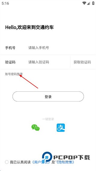2、进入交通约车的欢迎页面,找到账号密码登录选项,点击该选项切换到对应登录界面。