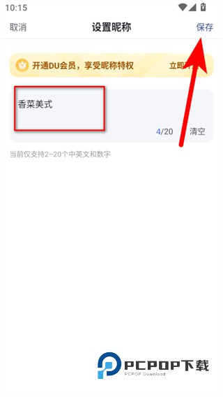 5、在设置昵称界面输入新的昵称内容后,点击右上角的保存按钮,即可完成昵称更换。
