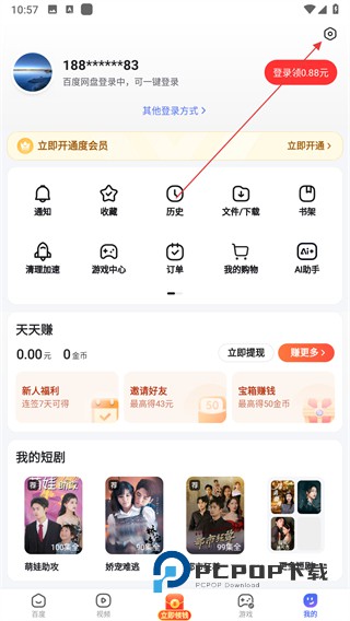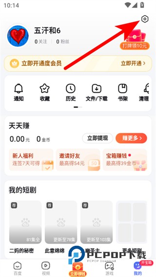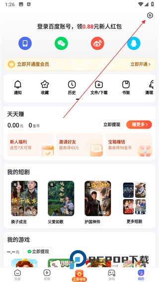 1、打开百度应用进入首页,进入个人中心页面,点击右上角的设置图标。
