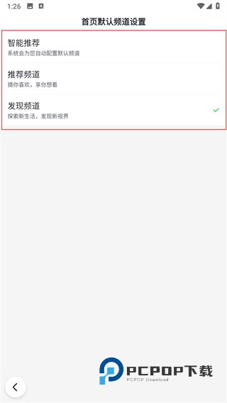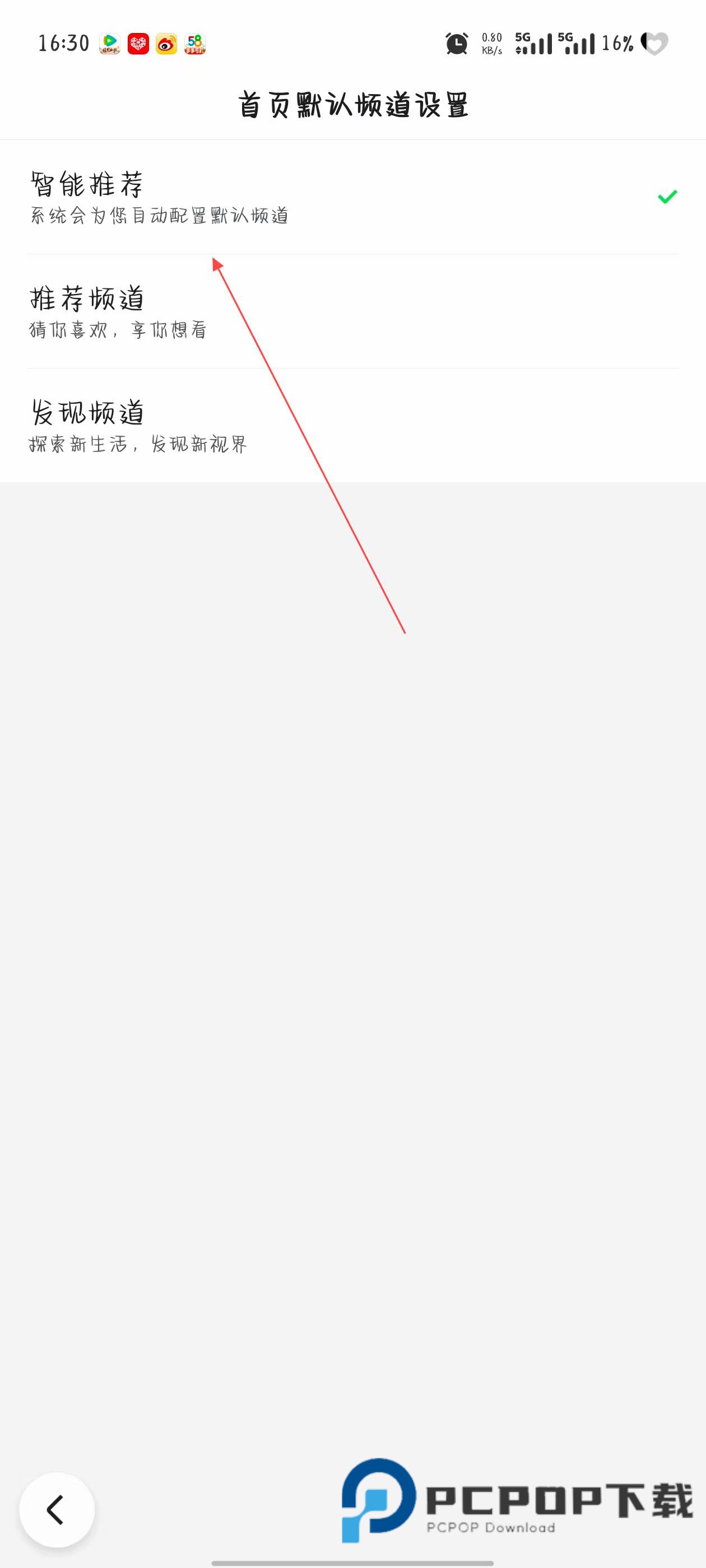 3、如果想要设置首页默认显示的频道类型,点击全部频道页面“默认首页设置右侧的智能推荐,在弹出的首页默认频道设置页面中,选择智能推荐,推荐频道或者发现频道等选项。