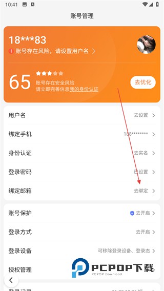 3、在账号管理页面里,找到绑定邮箱选项并点击,进入绑定邮箱页面。