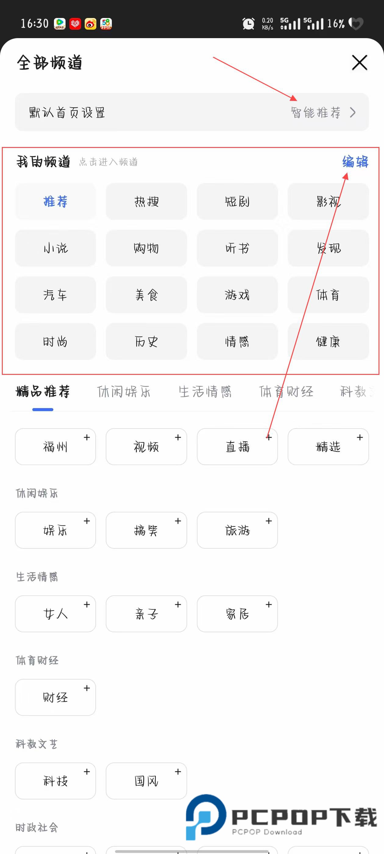 2、在全部频道页面,能看到我的频道区域,点击该区域右上角的编辑按钮,即可对已添加到频道栏的内容进行排序、删除等操作。