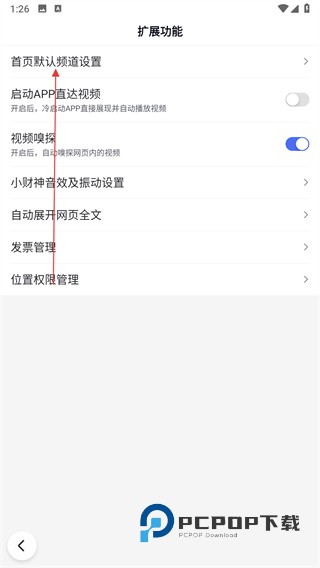 3、跳转至扩展功能的配置页面之后,在页面中选择首页默认频道设置。