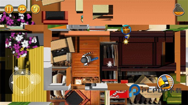 游戏开始之后我们会进入别人家的房间,我们可以控制人物前进,在游戏中闪光的地方就是可以拿到钱的地方,而有宝箱的地方则是钱最多的地方,另外我们点击右下角的跑步会加速我们的移动速度不过不能一直用是有冷却时间的限制的。