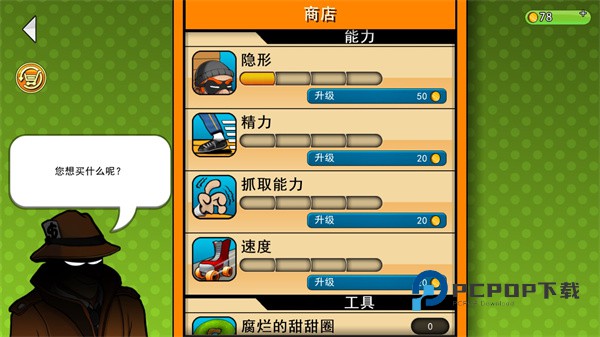 2、详解:我们都知道鲍勃的最终目的就是安全地拿到目标宝物,然后安全地离开。升级抢夺能力之后,我们拿目标宝物可以简单的多。所以放在速度和体力之后升级。