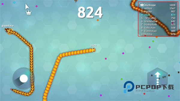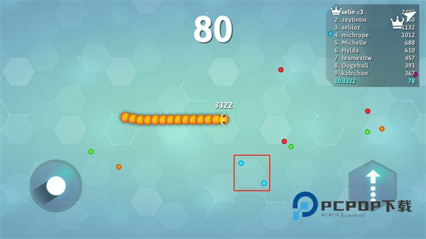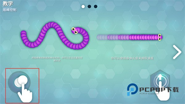 2、游戏中玩家需要通过游戏左下角的摇杆来控制小蛇来进行移动;