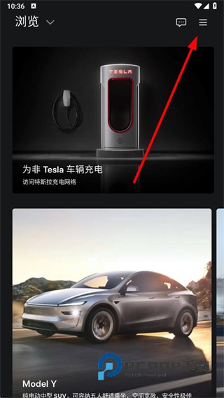 1、打开特斯拉app,点击界面左上角的浏览选项。