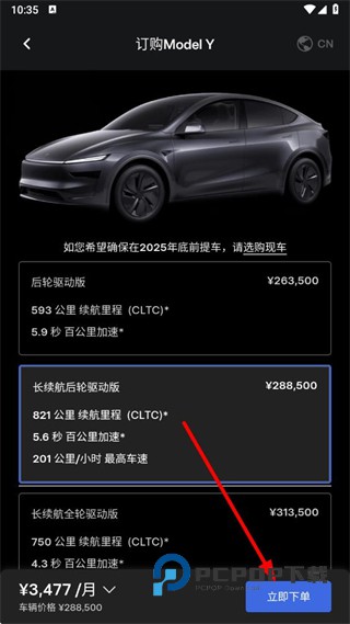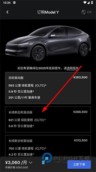 2、在订购页面中,选择所需的车型版本,确认其配置与价格信息。