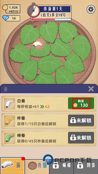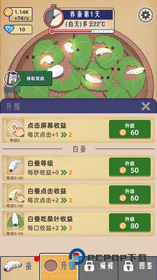 2、蚕的等级、收益等级、吃桑叶的收益等级都可以不断升级,这样就可以赚取更多的金币;