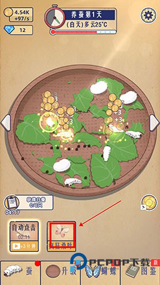 6、点击下方刚刚获得的蝴蝶可自动点击蚕宝宝加快金币的收益哦;