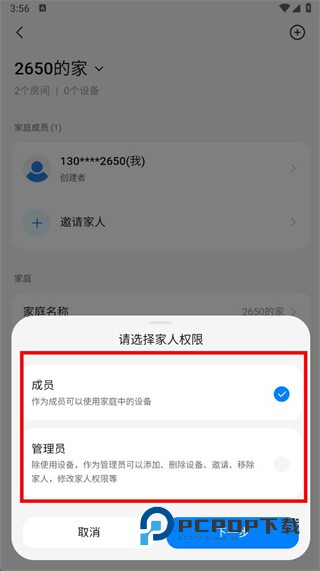 4、在家人权限选择页面选择成员或管理员权限后点击下一步。