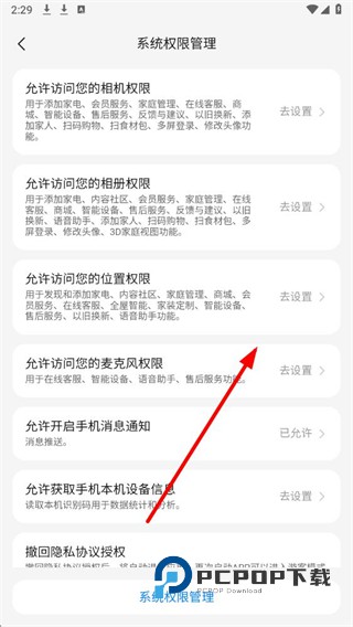 4、在系统权限管理页面,针对不同权限,点击对应项的去设置,即可调整该权限的授权状态,完成权限管理。